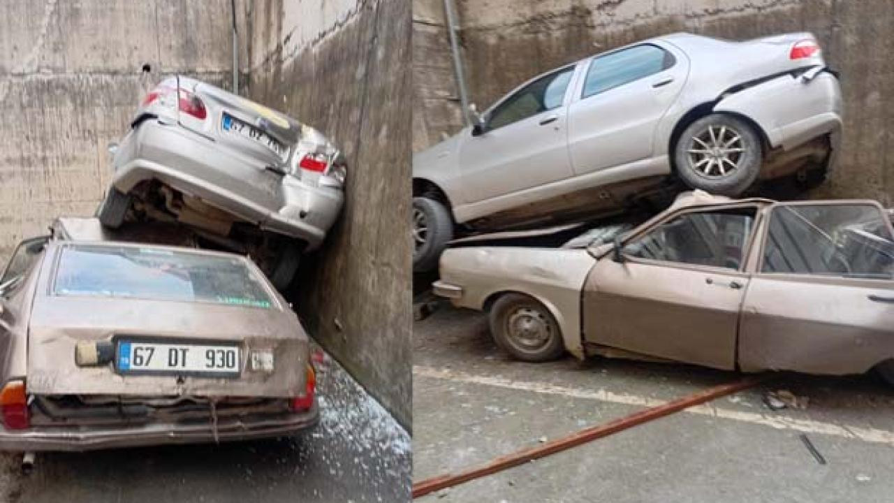 Rampadan geri kayıp 8 metrelik duvardan düştü: Park halindeki aracın üzerine çıktı