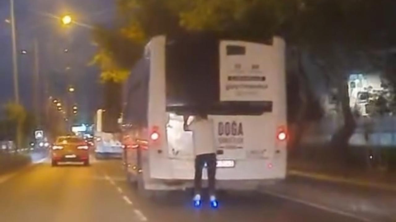 Çanakkale’de patenli bir kişinin otobüsün arkasındaki tehlikeli yolculuğu