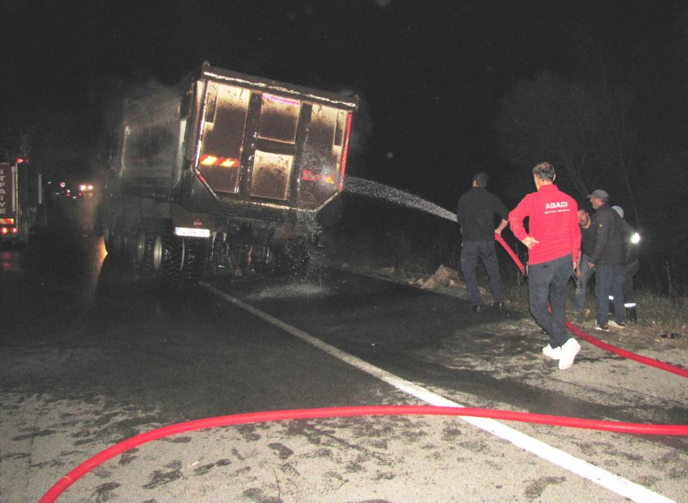 Hisarcıkta seyir halindeki kamyonun tekerleği patlayıp alev aldı