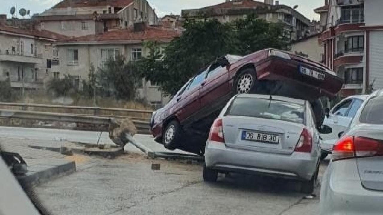 Trafik lambasına çarpan otomobil, ışıkta bekleyen otomobilin üzerine çıktı!