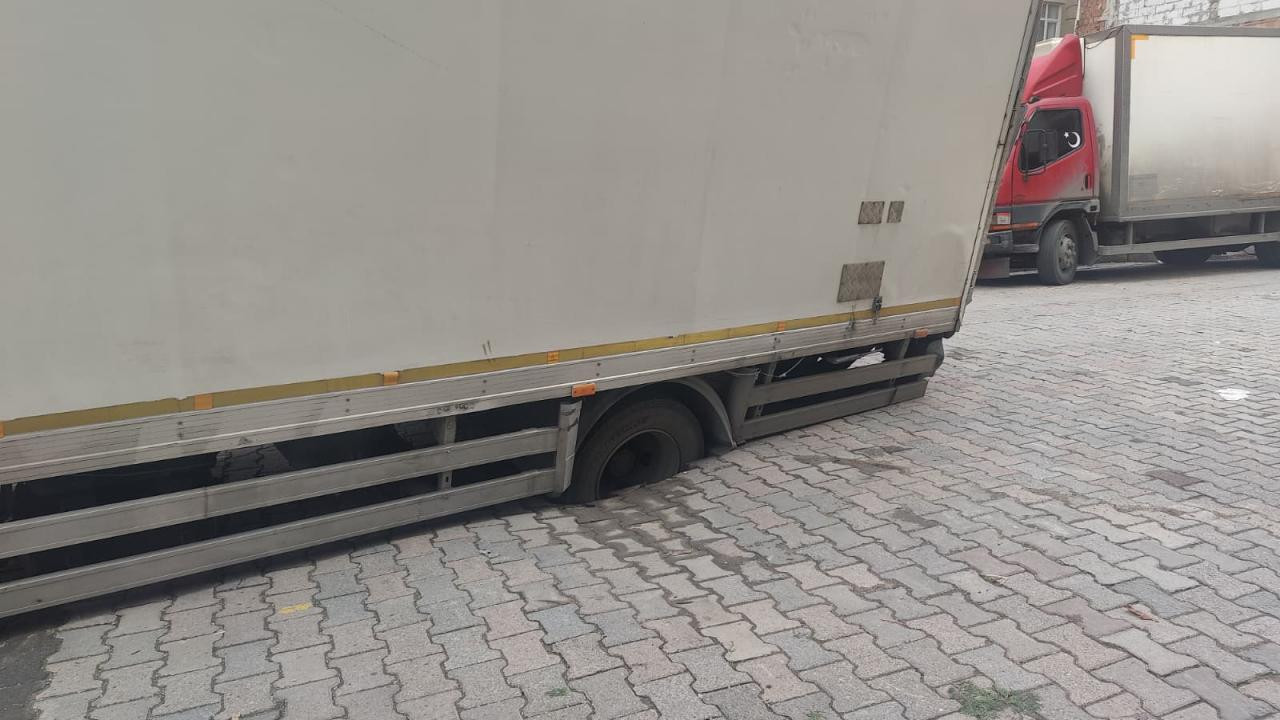Güngören’de kamyon, çöken yolda oluşan çukura saplandı